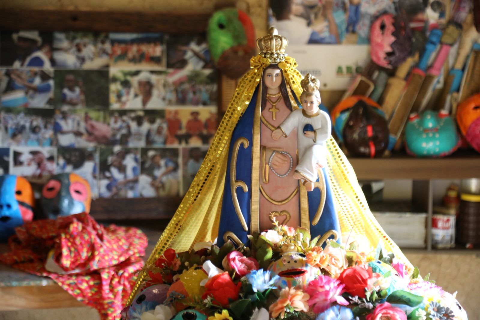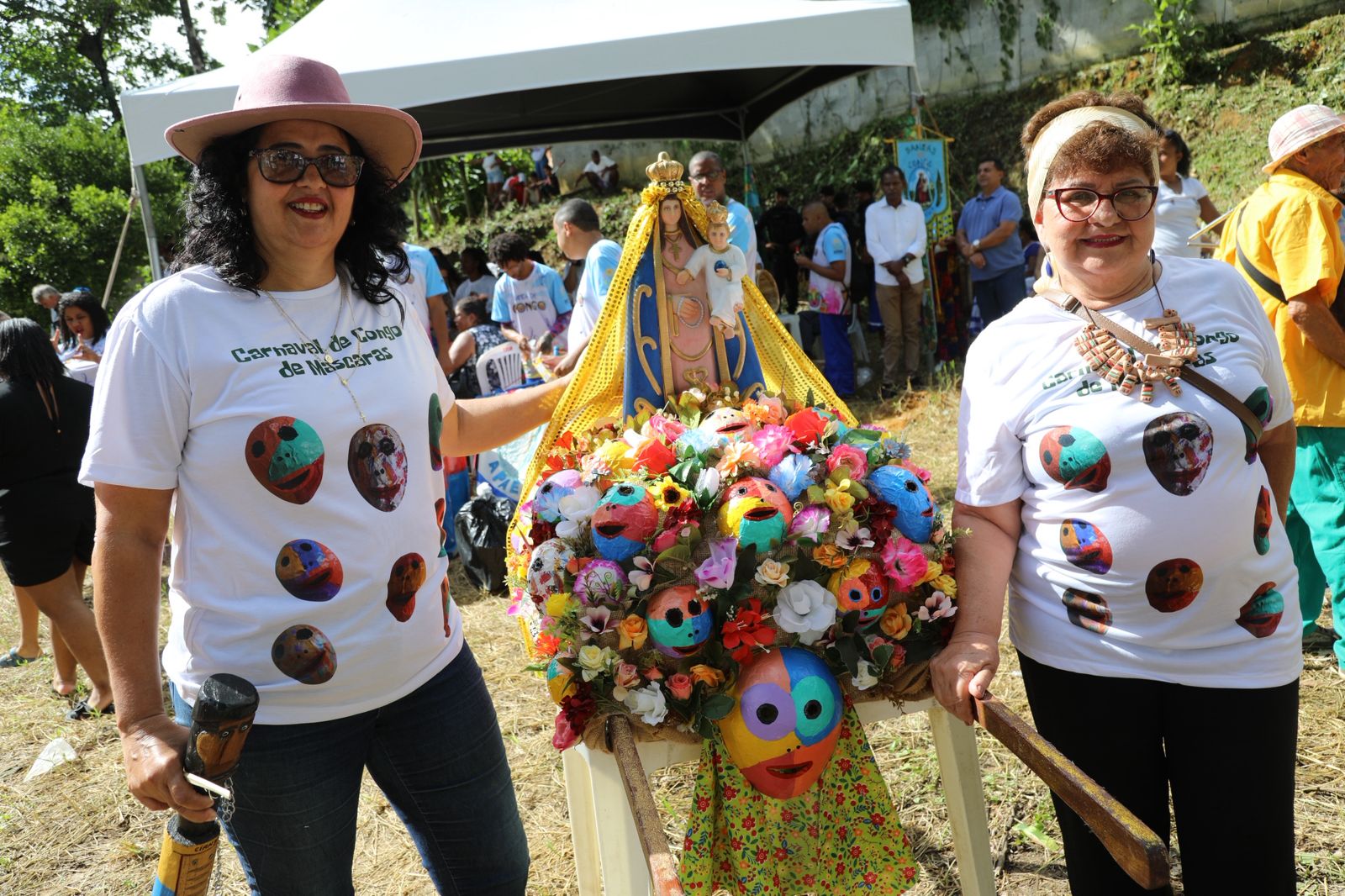 Há mais de 10 anos, as moradoras Dagmar Alves de Freitas e Eluciany Ferreira Mello são responsáveis pela confecção e decoração do adorno de Nossa Senhora da Penha para o Carnaval de Congo de Máscaras. O trabalho, feito todos os anos, é parte importante da preparação da festa e da homenagem à padroeira. “A gente faz tudo com muito cuidado e respeito. Já virou uma tradição para nós”, disse Dagmar. Eluciany também destacou a continuidade do trabalho ao longo dos anos. “É algo que a gente já faz há muito tempo e que tem um significado especial para a comunidade”, afirmou.